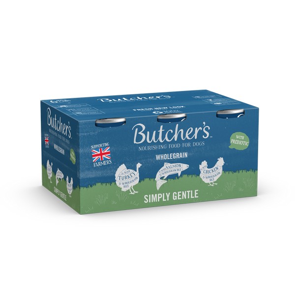 Butcher’s Simply Gentle Loaf Our Simply Gentle recipes are made with easy to digest wholegrain rice, a great source of fibre and slow-release energy, and added prebiotics to help support a healthy immune system. They’re ideal for dogs with sensitive tummies.Naturally gluten free No Nasties – No artificial colours, flavours or preservatives2 x with Chicken & Wholegrain Rice2 x with Salmon & Wholegrain Rice2 x with Turkey & Wholegrain Rice