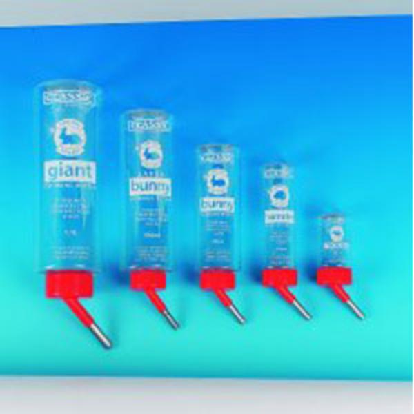 The Crystal De-Luxe range of animal drinking bottles are high strength and crystal clear and they are produced from fully recyclable bottle material. These bottles are also practically unbreakable. Other features include a printed capacity graduation, stainless steel twin ball point sleeves and attractive counter display packaging. This class leading range comes in five sizes: ranging from the 75ml mouse bottle upto the 1.1 litre giant bottle.