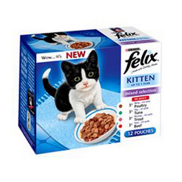 Felix Kitten contains all the proteins, vitamins and minerals a fast-growing bundle of mischief needs. It also happens to be delicious and bite-sized (a bit like your kitten). Choose from a range of delicious kitten-friendly alutrays or pouch multipacks. From tantalizing chicken in jelly to yummy plaice in jelly, which one will be your little rascal’s favourite? There’s only one way to find out?. CHICKEN INGREDIENTS Meat and animal derivatives (chicken min. 4%), minerals, various sugars. Contains EEC permitted colourants PLAICE INGREDIENTS Meat and animal derivatives, Fish and fish derivatives (plaice min. 4%), minerals, various sugars. LAMB INGREDIENTS Meat and animal derivatives (lamb min. 4%), minerals, various sugars. Contains EEC permitted colourants TYPICAL ANALYSIS Protein 10.0%, Oil 5.5%, Ash 2.5%, Fibre 0.5%, Moisture 80.5%. VITAMINS Vitamin A 2000 i.u./kg, Vitamin D3 200 i.u./kg, Vitamin E 16 mg/kg Vitamins guaranteed until this date, manufactured 2 years before. 20% ADDED PROTEIN ENERGY RICH FOR GROWTH* *COMPARED TO FELIX ADULT FOOD. BEEF INGREDIENTS Meat and animal derivatives (of which beef 4%), fish and fish derivatives, minerals, various sugars. POULTRY INGREDIENTS Meat and animal derivatives (of which poultry 4%), fish and fish derivatives, minerals, various sugars. TROUT INGREDIENTS Meat and animal derivatives, fish and fish derivatives (trout 4%), minerals, various sugars. TUNA INGREDIENTS Meat and animal derivatives, fish and fish derivatives (tuna 4%), minerals, various sugars. COD INGREDIENTS Meat and animal derivatives, fish and fish derivatives (cod 4%), minerals, various sugars. TYPICAL ANALYSIS Protein 10.0%, Oil 4.5%, Ash 2.5%, Fibre 0.5%, Moisture 82.0%. VITAMINS Vitamin A 1180 IU/kg, Vitamin D3 145 IU/kg, Vitamin E 10 mg/kg Vitamins guaranteed until this date, manufactured 2 years before. 20% ADDED PROTEIN ENERGY RICH FOR GROWTH* *COMPARED TO FELIX ADULT FOOD.