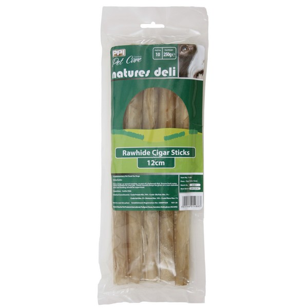 PPI Pet Care Essentials – Natures Deli Rawhide Cigar Sticks 12cm – pack size 10. A complementary pet food for dogs. Feeding guide: Feed as a treat or reward anytime as part of a balanced diet. Ensure fresh water is always available for your pet. Chews should always be gievn on a non-stainable surface and feeding should be supervised. Composition: Cattle Hide. Analytical Constituents: Crude Protein Min. 70% – Crude Oils / Fats Min. 1% – Crude Ash Max. 3% – Moisture Max. 18% – Crude Fibres Max. 1%. Store in cool dry place.
