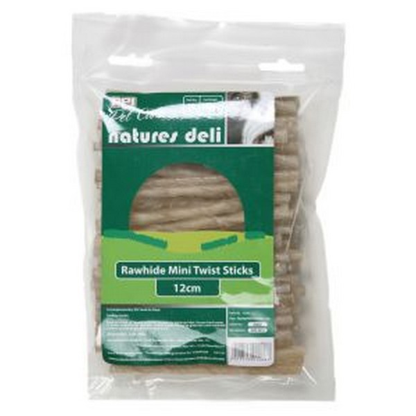 PPI Pet Care Essentials – Natures Deli Rawhide Mini Twist Sticks 12cm – pack size 50. A complementary pet food for dogs. Feeding guide: Feed as a treat or reward anytime as part of a balanced diet. Ensure that fresh water is always available for your pet. Chews should be given on a non-stainable surface and feeding should be supervised. Composition: Cattle Hide. Analytical Constituents: Crude Protein Min. 70% – Crude Oils / Fats Min. 1% – Crude Ash Max. 3% – Moisture Max. 18% – Crude FibresMax. 1%. Store in a cool dry place.