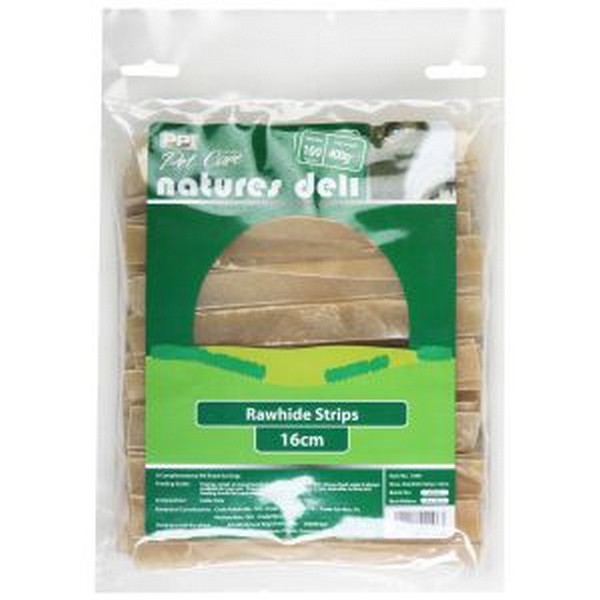 PPI Pet Care Essentials – Natures Deli Rawhide Strips 16cm – 400g A complementary pet food for dogs. Feeding guide: Feed as a treat or reward anytime as part of a balanced diet. Ensure fresh water is always available for your pet. Chews should always be given on a non-stainable surface and feeding should be supervised. Composition: Cattle Hide. Analytical Constituents: Crude Protein Min. 70% – Crude Oils / Fats Min. 1% – Crude Ash Max. 3% – Moisture Max. 18% – Crude Fibres Max. 1%. Store in cool dry place.