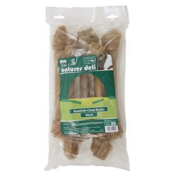 PPI Pet Care Essentials – Natures Deli Rawhide Chew Knots 30cm – pack size 5. A complementary pet food for dogs. Feeding guide: Feed as a treat or reward anytime as part of a balanced diet. Ensure fresh water is always available for your pet. Chews should always be given on a non-stainable surface and feeding should be supervised. Composition: Cattle Hide. Analytical Constituents: Crude Protein Min. 70% – Crude Oils / Fats Min. 1% – Crude Ash Max. 3% – Moisture Max. 18% – Crude Fibres Max. 1% Store in a cool dry place.