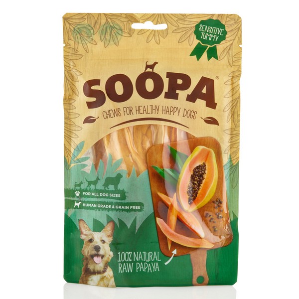Soopa All Natural Papaya Chews A juicy and delicious dog treat packed with disease busting vitamins, minerals and anti-oxidants too. Papaya contains ‘papain’ a digestive enzyme known for aiding digestion of proteins and also helps to soothe the stomach if upset. Papaya also contains anti-parasite properties that may benefit dogs against parasites. If your dog has bad breath that isn’t attributed to poor oral health the smell can often emanate from the stomach. It’s worth looking at the food you are feeding but papaya definitely helps break down obnoxious gases and funny smells. Simple, delicious, nutritious and best of all dogs LOVE them!Suitable for dogs with kidney/liver disease, diabetes, obesity, pancreatitis and allergies.