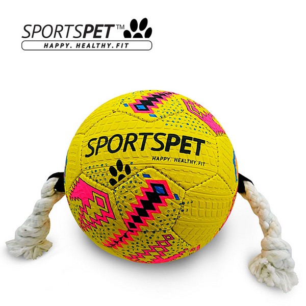 As a sports company SPORTSPET fully understand how important an active and healthy lifestyle is, this of course is equally true for our pets. With a genuine focus on quality, SPORTSPET products aren’t just fun, but they are also extremely safe and durable meaning that particular attention is paid to the materials used. Before becoming part of the range SPORTSPET products are rigorously tested by a reliable pet testing team, they love the products and hope you and your pets love them too. The SPORTSPET Football dog toy is a top quality, proper football which has been adapted so you can enjoy a real kick about with your dog. Each ball has been carefully hand stitched, just like the ones the pros play with, and the addition of the durable grips mean that your dog cannot only dribble with the ball, but they can now handle it just like the goalie! The SPORTSPET football can be used on all surfaces and 100% natural rubber panels and cotton grips ensure a safe game.