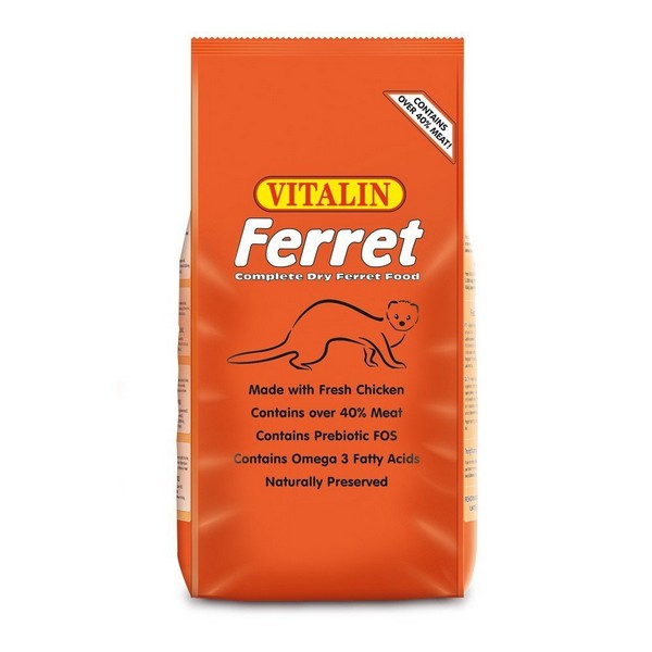 Vitalin Ferret is a nutritionally complete balanced premium ferret food in an extruded kibble, and does not require any additional meat or supplements. Vitalin Ferret is made with over 40% meat, including prime fresh chicken & premium chicken meat meal for maximum palatability and digestibility. As carnivores, it is essential that ferrets digest high levels of meat to provide the necessary proteins they require. Whole cooked rice is also included as an excellent source of natural carbohydrate. Vitalin Ferret contains high levels of antioxidant vitamins and minerals, including beta carotene, vitamin C, copper and organic selenium to aid immunity and optimise fertility. Carefully balanced levels of calcium, phosphorus and vitamin D help promote strong teeth and bones, while the high levels of B-vitamins and taurine boost metabolism and deliver excellent energy provision. High levels of Omega 3 fatty acids give excellent skin and coat condition whilst yucca extract helps to minimise unwanted odours. Vitalin Ferret also includes Prebiotic FOS (fructo-oligosaccarides) to promote the growth of healthy gut bacteria and thereby improves digestion. Contains no artificial colours, flavours or preservatives. INGREDIENTS Fresh Chicken and Chicken Meat Meal, Whole Rice, Herring Meal, Whole Egg, Chicken Liver & Sugar Beet, Vitamins & Minerals. ANALYSIS Protein 40%, Oil 20%, Fibre 2%, Ash 10%, Copper 18 mg/kg, Vitamin – A 27,000 iu/kg, Vitamin D3 – 1,500 iu/kg, Vitamin E – 175 iu/kg. Vitamin Potency ? 12 months from date of manufacture FEEDING GUIDE KITS – Vitalin Ferret Food can be fed to kits from as early as 3 to 4 weeks. During the first week we would recommend feeding small quantities of fresh Vitalin Ferret Food regularly, softening the food with a little warm water. Reduce the quantity of water throughout the week and feed dry from the second week onwards. ADULTS – Vitalin Ferret should be fed dry and can be given on a free feed basis, a normal adult will require between 40-60 grams per day. When Vitalin Ferret is being introduced to replace another diet it should be introduced slowly over a 7-day period to help minimise any digestive problems. Pregnant/Lactating Jills should be allowed to free feed.